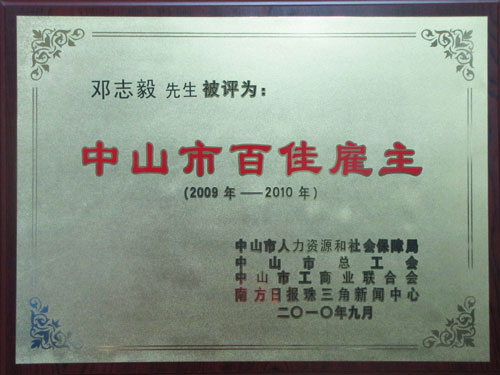 2010年9月13日下午2:00,中山市2010年度百佳雇主頒獎典禮暨“同是中山建設者”百佳流動務工人員評選活動啟動儀式在市文化藝術中心大劇場舉行。伴隨著現(xiàn)場近千名觀眾的熱烈掌聲,由中山市人力資源和社會保障局、中山市總工會、中山市工商聯(lián)以及南方日報珠三角新聞中心共同舉辦的“中山市首屆百佳雇主”評選結(jié)果正式揭曉,我司在眾多申報企業(yè)中脫穎而出,獲“中山市首屆百佳雇主”殊榮。