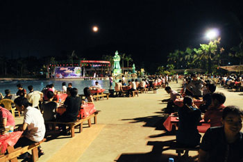 活動(dòng)當(dāng)日,長(zhǎng)江水世界流光溢彩、歌聲飛揚(yáng)。在造浪池沙灘旁,圓月當(dāng)空、濤聲拍岸,領(lǐng)導(dǎo)與員工濟(jì)濟(jì)一堂,共仰明月,齊享美食,并不時(shí)走動(dòng)暢談。公司為到場(chǎng)的所有員工和家屬提供了豐盛的應(yīng)節(jié)食品,包括各式月餅、爽滑雞粥、濕炒河粉、新鮮水果、芋頭、菱角等,現(xiàn)場(chǎng)氣氛和美,其樂融融,讓員工真正感受到了金馬“家”的溫暖貼心。