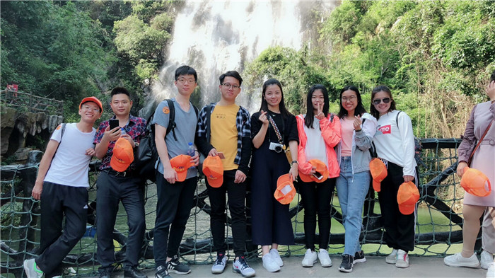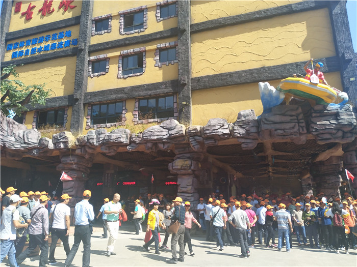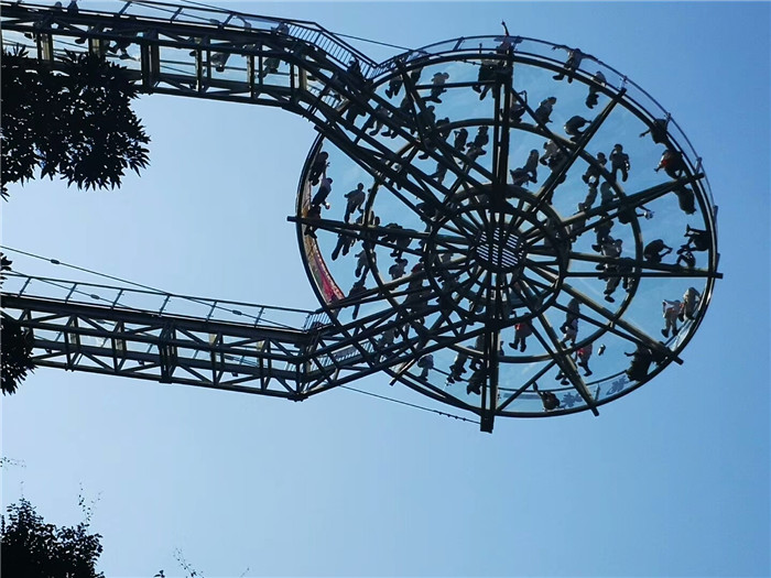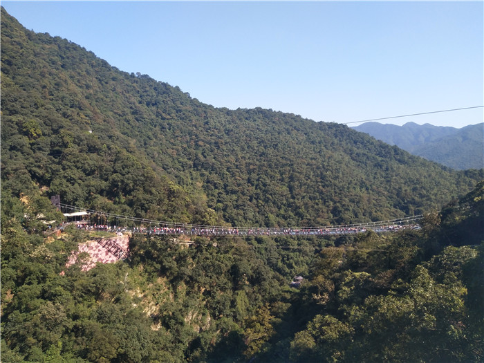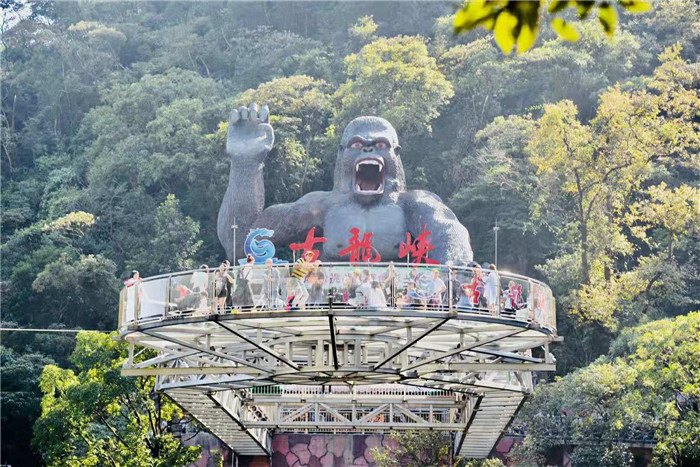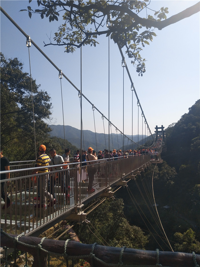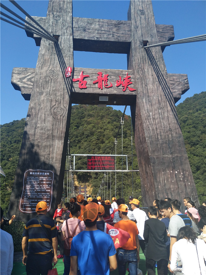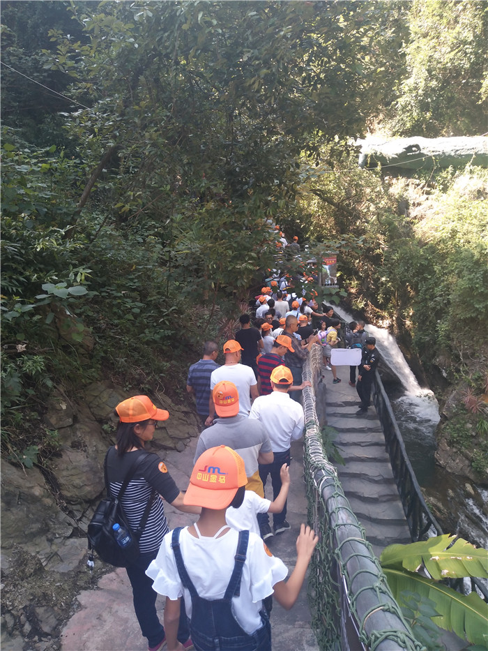 抵達目的地1——清遠古龍峽云天波霸。這個以獲得四項世界紀錄著稱的景區(qū)景區(qū),逢周末閑日和天公作美,此刻更是人山人海,縱使如此,500多名金馬人們?nèi)允浅尸F(xiàn)出了良好的團體素質(zhì)和修養(yǎng),文明就餐、有序排隊、耐心等候......景區(qū)內(nèi)仿佛形成了一道新的橙色人文風(fēng)景線。隨后,沿途爬山、觀光、賞瀑、自拍、擺拍、合影......歡笑和驚呼連綿不斷。走上最大規(guī)模的高空觀光玻璃組合云天波霸,驚險和刺激正式登場:世界最長最寬的329米觀瀑玻璃橋、UFO造型的懸空玻璃平臺、“守護神”巨型猩猩雕塑,漫步其中,猶如閑庭散步;俯視下方,卻又步步驚心!