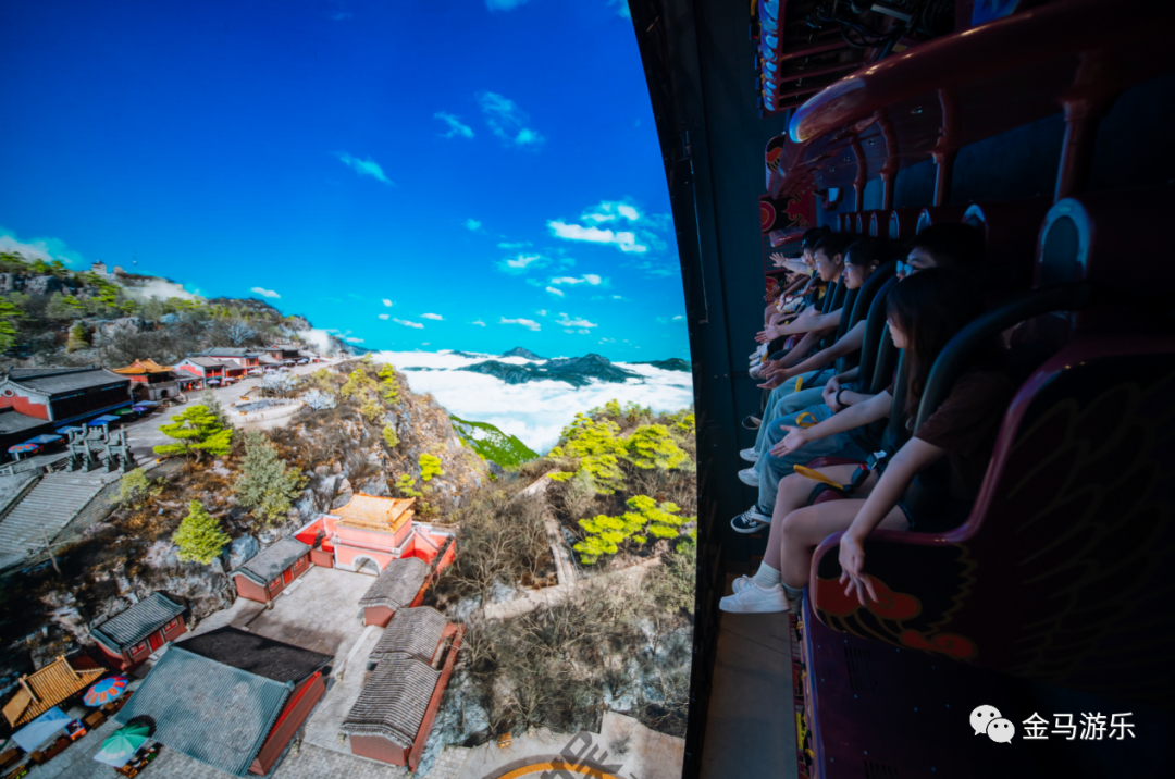 《飛越泰山》項(xiàng)目是目前全國最大的翻轉(zhuǎn)式飛行影院,2900㎡立體影院,可容納96人觀影。影視內(nèi)容以泰山及泰安地域文化為主旋律,通過多自由度動感座椅與巨幕8K影視畫面結(jié)合,令游客仿佛乘坐飛行器置身高空凌空飛翔,從云海出發(fā),飛越泰山、泰安老街、天平湖景區(qū)等場景。飛越視角高低快慢,配合噴氣、噴水等特效,讓游客以虛擬沉浸方式飽覽五岳獨(dú)尊的壯麗巍峨。