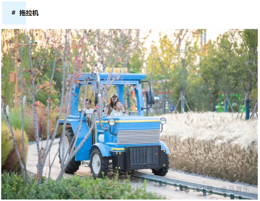 拖拉機(jī)是一款模擬農(nóng)用拖拉機(jī)造型為主題的小火車(chē)類(lèi)型設(shè)備,車(chē)輛外觀造型和內(nèi)飾均逼真還原真實(shí)的拖拉機(jī),孩子可以通過(guò)把玩方向盤(pán),手動(dòng)撥桿等部件體驗(yàn)駕駛拖拉機(jī)的感覺(jué),豐富孩子的認(rèn)知,增加觀光游玩的趣味性。拖拉機(jī)每輛車(chē)設(shè)置4個(gè)座位,前排為兒童座,后排為成人座,一家人乘坐拖拉機(jī)穿梭在美麗的風(fēng)景中,欣賞美景的同時(shí)共享天倫之樂(lè)。