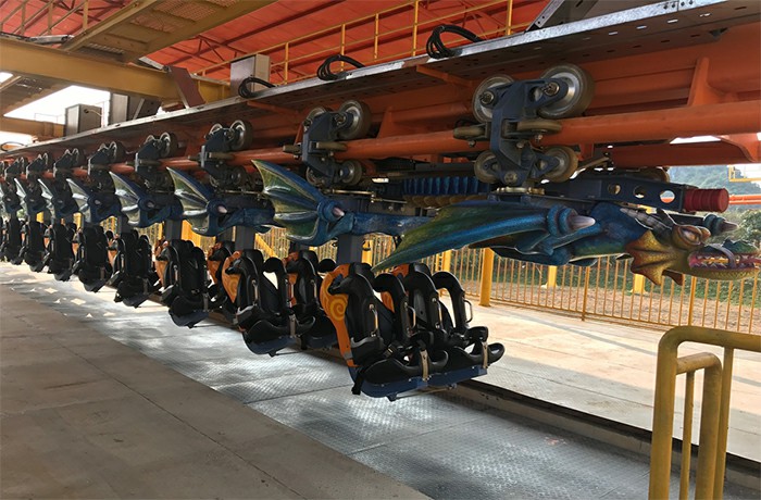 懸掛過山車的列車座椅懸掛于軌道下方,乘客懸空而坐,增加體驗(yàn)刺激度。列車經(jīng)由動力提升到軌道最高端后,轉(zhuǎn)為沿軌道自由高速滑行,乘客坐于座椅上時(shí)盡情地享受失重、倒轉(zhuǎn)和離心的強(qiáng)烈感覺。列車外觀可根據(jù)樂園特色定制,幫助樂園打造專屬特色。