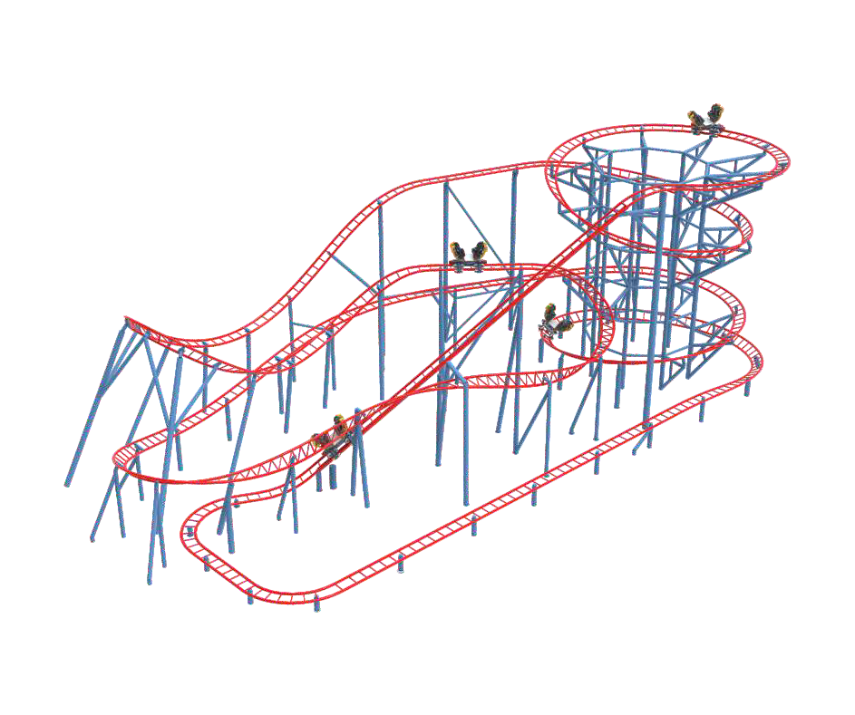超炫過山車結合720°螺旋下降、水平螺旋環(huán)的運動方式,配合自轉回旋車體,同時創(chuàng)新地將過山車有傾?的路軌引到自旋滑車的軌道中,打造出兼具失重、超重和回旋的多重乘坐體驗。四人座車體中,游客兩兩對坐,互動交流有趣。該設備適合親?、情侶群體游客游玩。