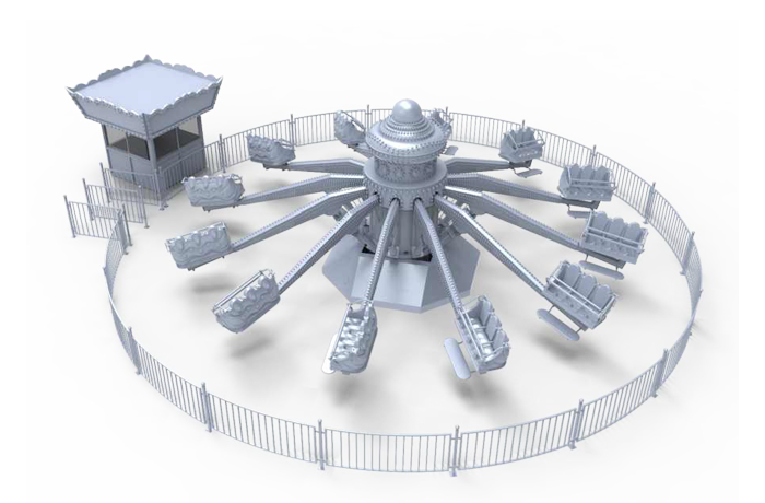 彈跳機(jī)中軸為中心帶動周圍十二個座艙繞豎直中軸旋轉(zhuǎn),同時(shí)座艙伴隨著音樂進(jìn)行高低、快慢不同的跳躍式運(yùn)動。使乘客在游玩過程中體驗(yàn)到旋轉(zhuǎn)加跳躍的樂趣。