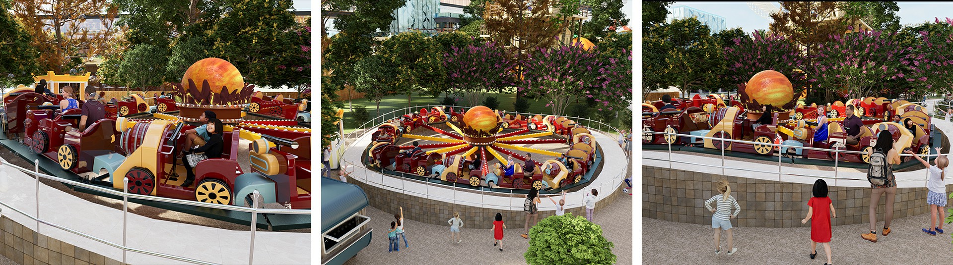 YKC-48B型烈焰戰(zhàn)車,以戰(zhàn)車追逐恒星為主題,中間支撐座裝有回轉支承連接16條轉臂。每條轉臂自帶行走輪,其中四條轉臂帶有驅動裝置,而16個座艙分別安裝在轉臂之間。轉臂行走輪下方布置有環(huán)形的起伏路軌,在轉臂驅動 裝置的驅動下,烈焰車體圍繞中心的恒星高低起伏轉動,座艙隨轉臂旋轉運動 的同時,并沿路軌上下運動,使乘客體驗多重復合旋轉運動帶來的樂趣。