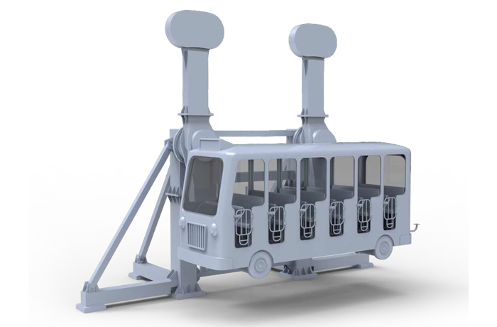 瘋狂巴士配備雙向可逆無級自動調速系統(tǒng),經過減速、分速等一系列機構,實現(xiàn)一臺電機帶動兩個驅動臂的擺動,帶動巴士的平動,巴士在電氣系統(tǒng)的控制下可以實現(xiàn)正反兩種通過最高點的運動,給乘客以歡樂搖擺的體驗。
