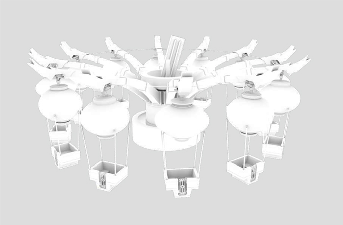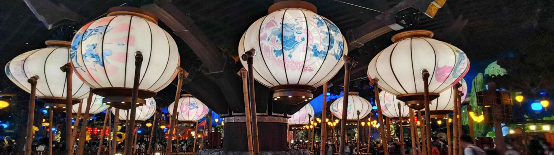 逍遙花燈集旋轉(zhuǎn)、升降運(yùn)動(dòng)形式于一體。在運(yùn)行過程中,轉(zhuǎn)盤會(huì)以15°的傾?進(jìn)行旋轉(zhuǎn),乘客在吊籃中邊體驗(yàn)離心力作用下的外擺及高低起伏的回旋飄蕩,邊欣賞燈籠光影變幻下的皮影故事。