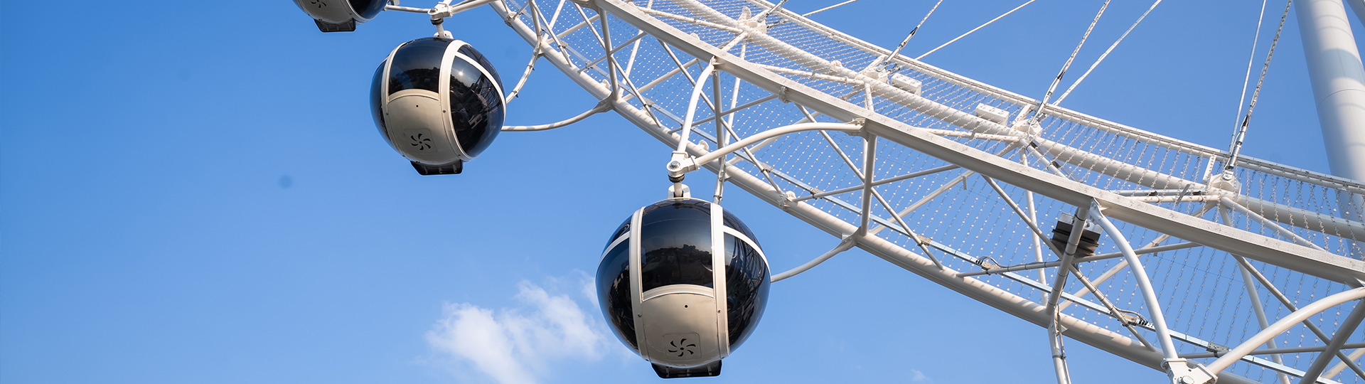 88?觀覽?,塔架由6根?柱構成,觀覽?的設計打破傳統(tǒng)摩天輪的界限,將拉膜造型與摩天輪相互結合,融為?體,使摩天輪在感官上更加宏偉壯觀,專為地標項?打造。夜幕降臨,摩天輪運作時配以明麗變幻的燈飾與外觀造型相互呼應,使得摩天輪成為閃耀的地標打卡點。