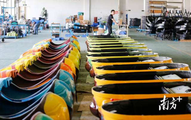 在金馬游樂港口鎮(zhèn)廠區(qū)的生產車間內,一些制作完成的碰碰車外殼碼放整齊,等待出庫?;厮葸^去30余年,這個小小的游藝車里承載了“金馬”的創(chuàng)業(yè)史。