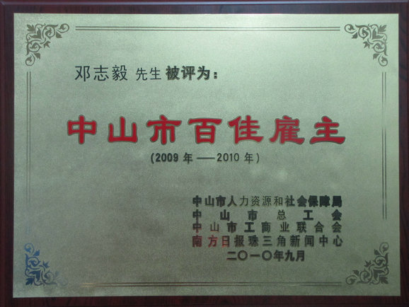 2010年9月13日下午2:00,中山市2010年度百佳雇主頒獎(jiǎng)典禮暨“同是中山建設(shè)者”百佳流動(dòng)務(wù)工人員評(píng)選活動(dòng)啟動(dòng)儀式在市文化藝術(shù)中心大劇場舉行。伴隨著現(xiàn)場近千名觀眾的熱烈掌聲,由中山市人力資源和社會(huì)保障局、中山市總工會(huì)、中山市工商聯(lián)以及南方日?qǐng)?bào)珠三角新聞中心共同舉辦的“中山市首屆百佳雇主”評(píng)選結(jié)果正式揭曉,我司在眾多申報(bào)企業(yè)中脫穎而出,獲“中山市首屆百佳雇主”殊榮。